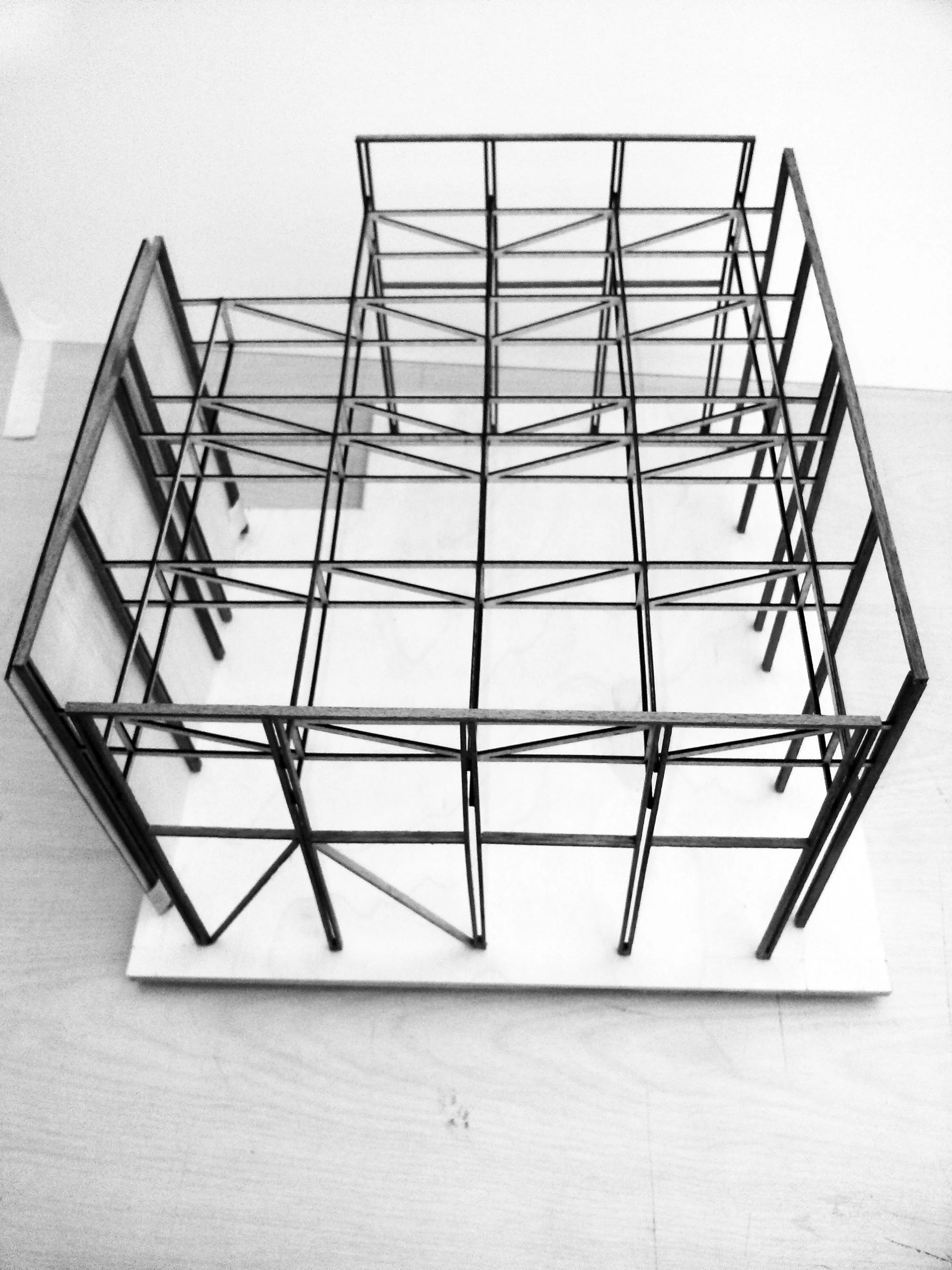 The Steel ‘box’ exoskeleton consists of Mild Steel columns 66x33mm, - these are doubled up to reinforce an idea of slenderness. The roofing structure consists of a thin truss system made up of 50x50mm square MS sections. This truss system supports fifteen precast funicular concrete shells that generate the spanning system for the roof.